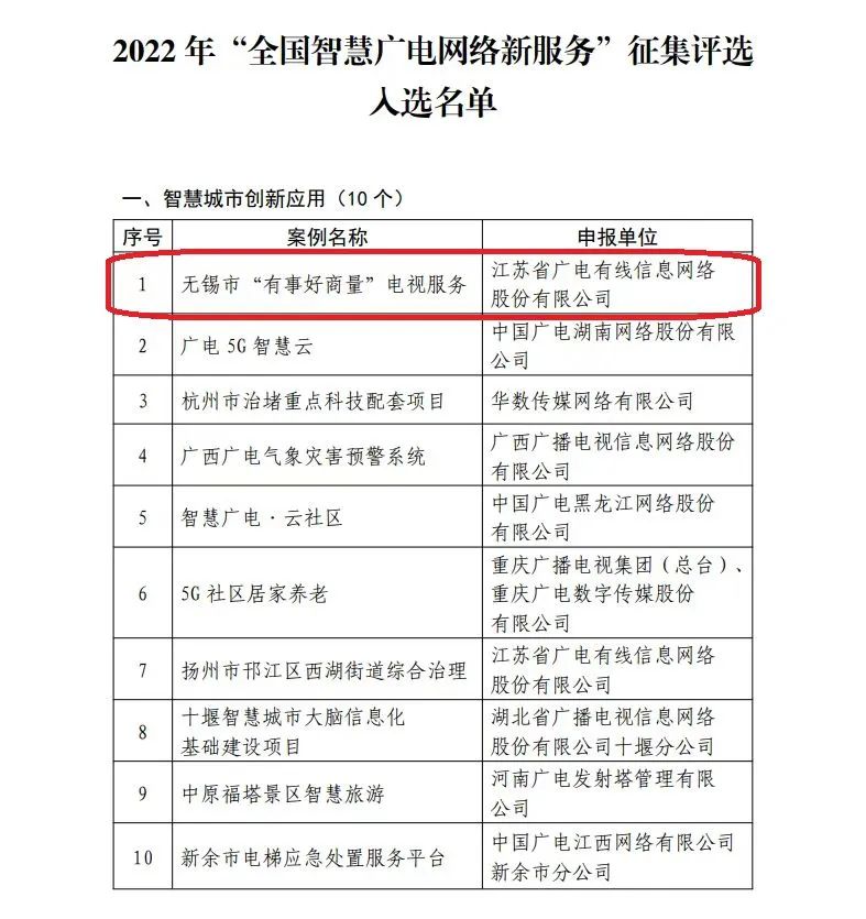 經過復評和終評,由江蘇有線無錫分公司建設的無錫市“有事好商量”電視服務項目入選2022年“全國智慧廣電網絡新服務”之智慧城市創新應用10佳案列,并位列首位。