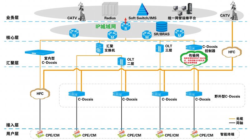 光節點處,有光站的地方無需拆除,無光站的節點可使用多合一CMTS設備,方便部署。