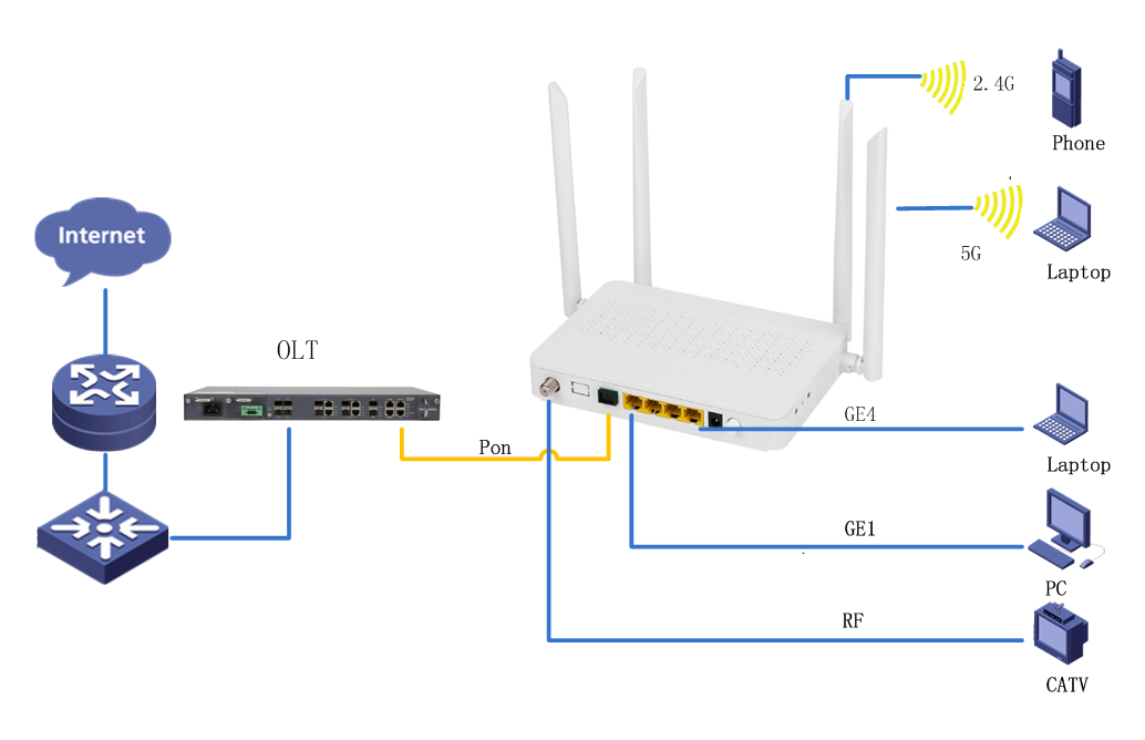 Support fast transmission of hardware NAT Hardware Specifications         interface: 1* G/EPON+4*GE+2.4G/5.8G WLAN+1*RF